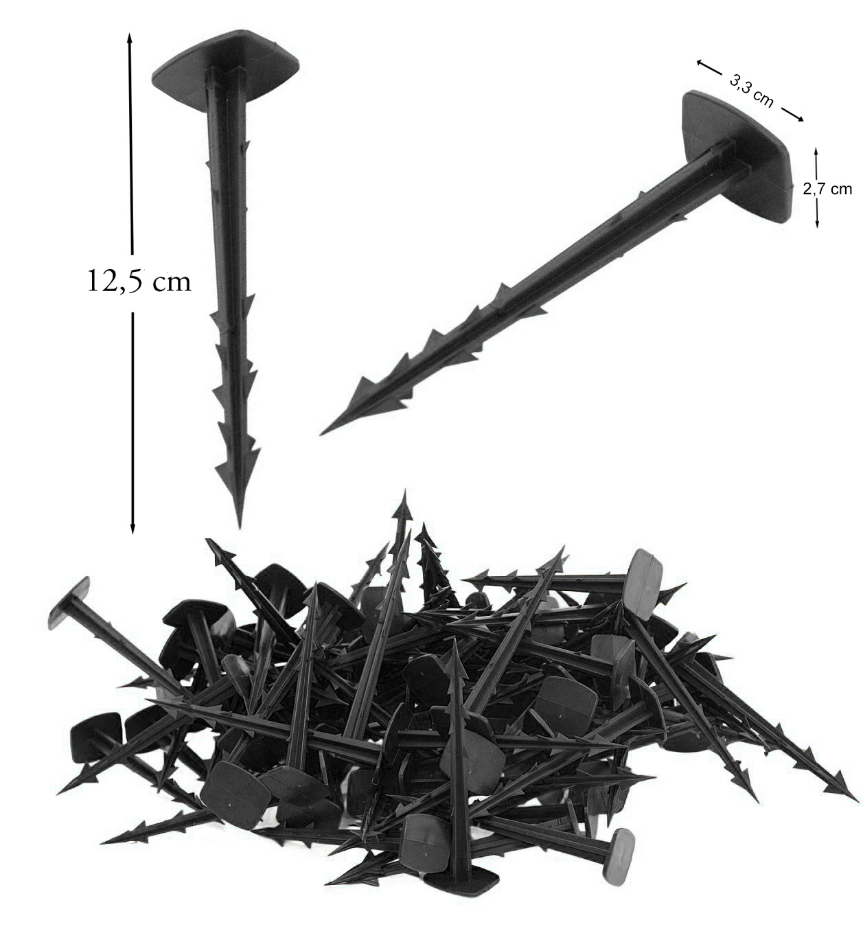 Duża średnica główki dociska mocowany produkt do podłoża, zapobiegając podnoszeniu oraz przesuwaniu. Ostre zakończenie kołka z łatwością pozwala na przebicie grubej agrowłókniny czy maty szkółkarskiej bez użycia noża. Kształt harpuna powoduje mocne zakotwiczenie w gruncie i utrudnia wyciągnięcie kołka z podłoża.